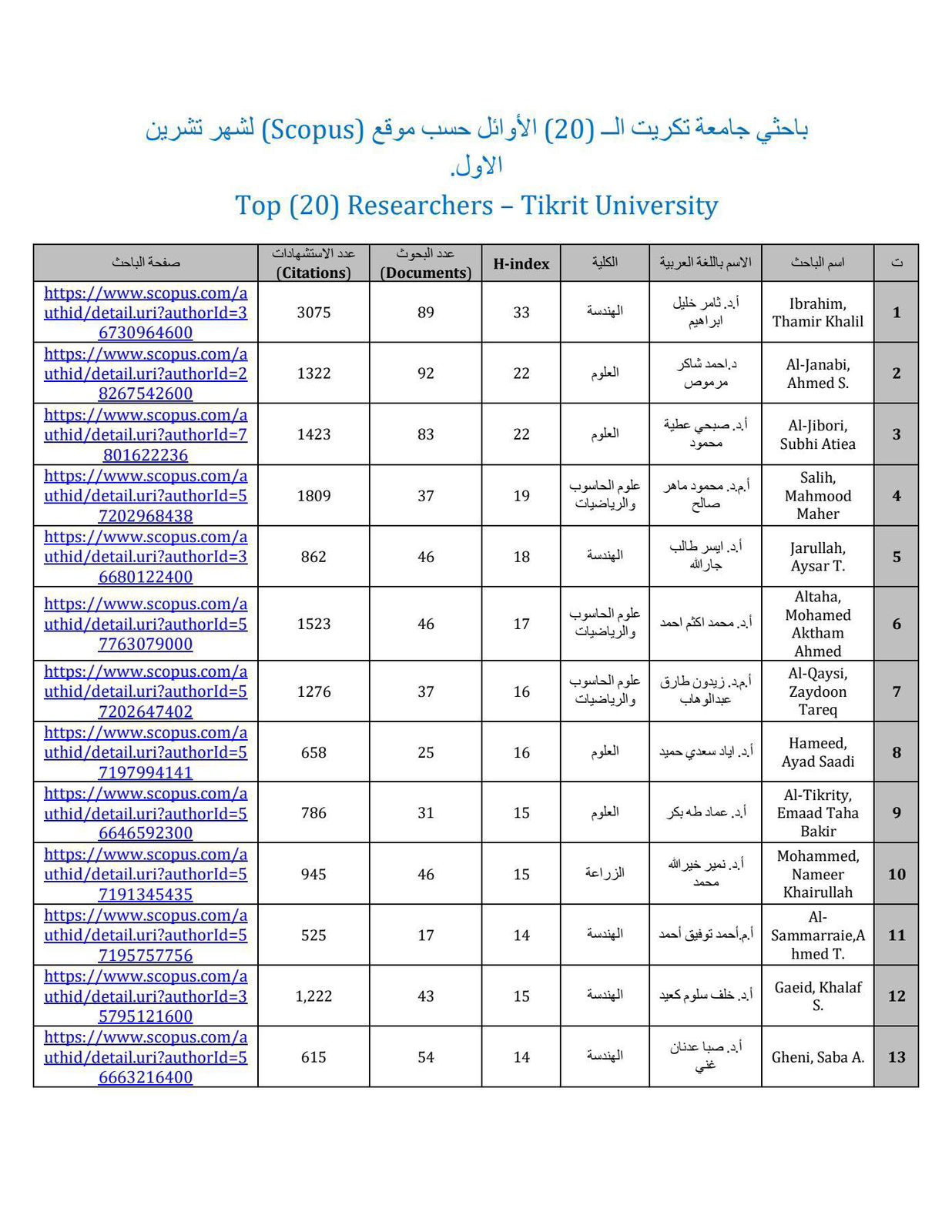 يُسعدنا أن نعلن عن إحصائية شهر تشرين الأول 2025 الخاصة بأعلى مؤشر H-index لباحثي جامعتنا في مستوعب Scopus، والتي تعكس جهود الباحثين المتميزة في مجال البحث العلمي والنشر الدولي